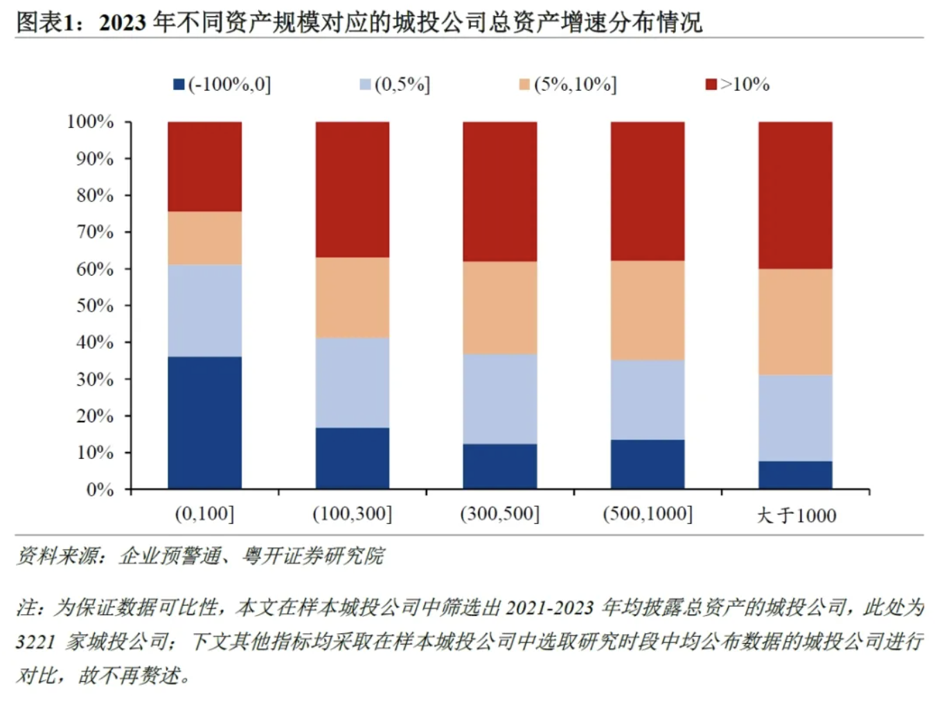 从资产分布来看,呈现出明显的马太效应,即强者愈强、弱者愈弱。随着城投公司总资产规模的增加,高增长的公司占比逐渐提升,负增长的公司占比逐渐减少。具体来看,资产规模超过1000亿元的城投公司中,40.1%的城投公司总资产增速超过10%,仅有7.7%的公司总资产为负增长;而资产规模在300-500亿元、100-300亿元和100亿元以下的城投公司总资产负增长的比例分别为12.4%、16.7%和36.1%。这种趋势既反映了当前经济面临下行压力时大型城投公司的抗压能力更强,也与一揽子化债政策下城投公司加快重组整合相关。
