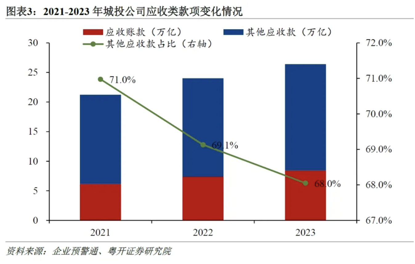 三是城投公司应收类款项结构上出现两点积极变化,其他应收款以及来自政府的占比减少。截至2023年底,城投公司应收类款项(应收账款与其他应收款合计)规模为26.4万亿元,较上年增长10.0%,占总资产的比重为4.5%,较2022年上升0.2个百分点,反映出城投公司应收类款项仍处于持续扩张中。