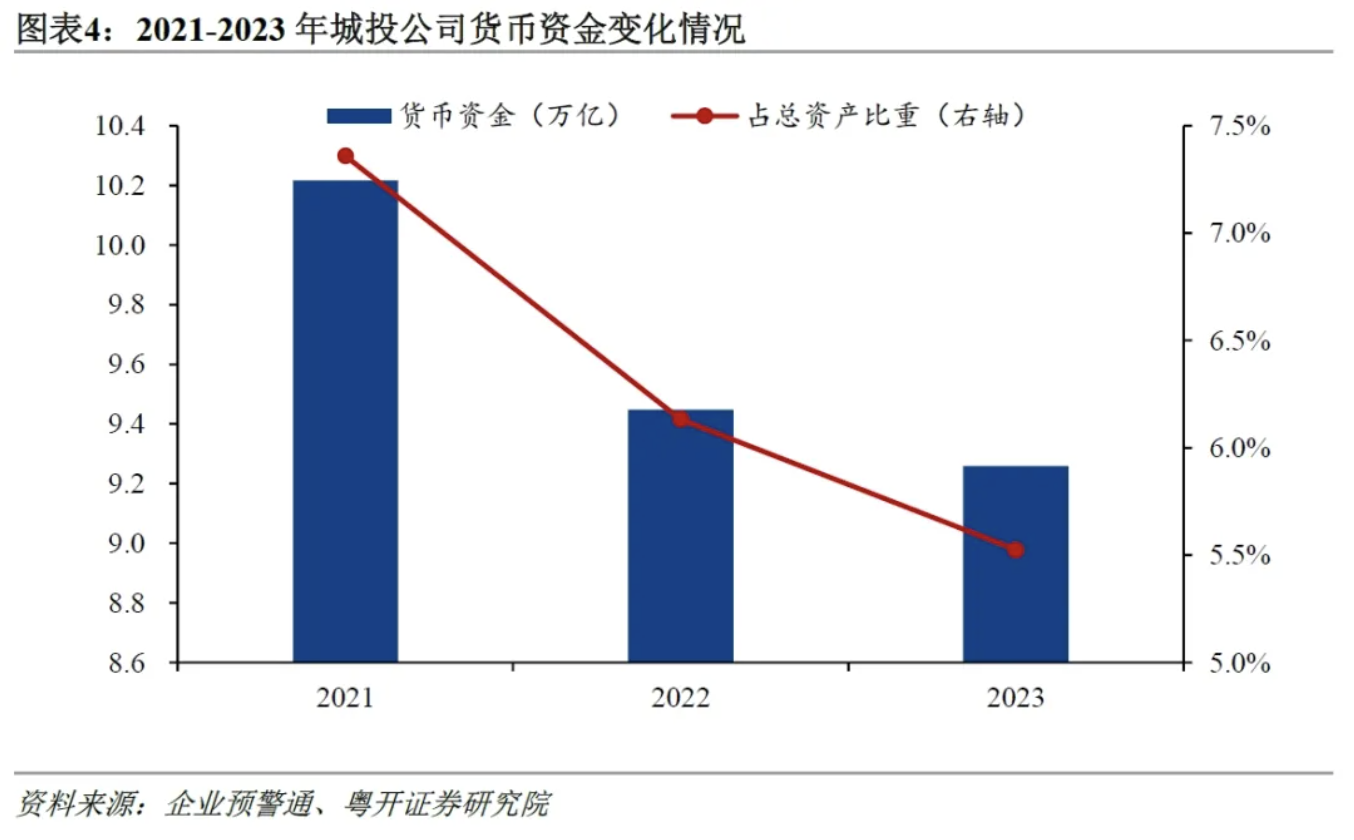 四是监管趋严下,城投公司外部融资难度增加,货币资金显著减少。截至2023年底,城投公司的货币资金规模为9.3万亿元,较上年减少2.0%,占总资产的比重为5.5%,较上年下降0.6个百分点,主要源于监管趋严下城投公司外部融资收紧。从公开发行的城投债券来看,2023年以来,城投债券发行审核趋严、借新还旧比例明显上升。受此影响城投债券净融资规模自2023年11月开始转负,11月和12月的净融资额分别为-678.7亿元和-1181.8亿元。2023年全年城投债券净融资规模为8756亿元,较上年增长4.3%,但相比2021年下降54.2%。