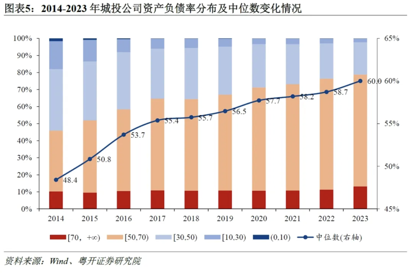 五是城投公司总负债规模持续扩大,其增速超过总资产的增速,导致资产负债走高。截至2023年末,城投公司总负债规模达到105.7万亿元,较上年增长10.1%,超过总资产增速1.4个百分点。这导致城投公司的资产负债率上升,2023年城投公司资产负债率中位数为59.4%,较上年上升1.3个百分点。