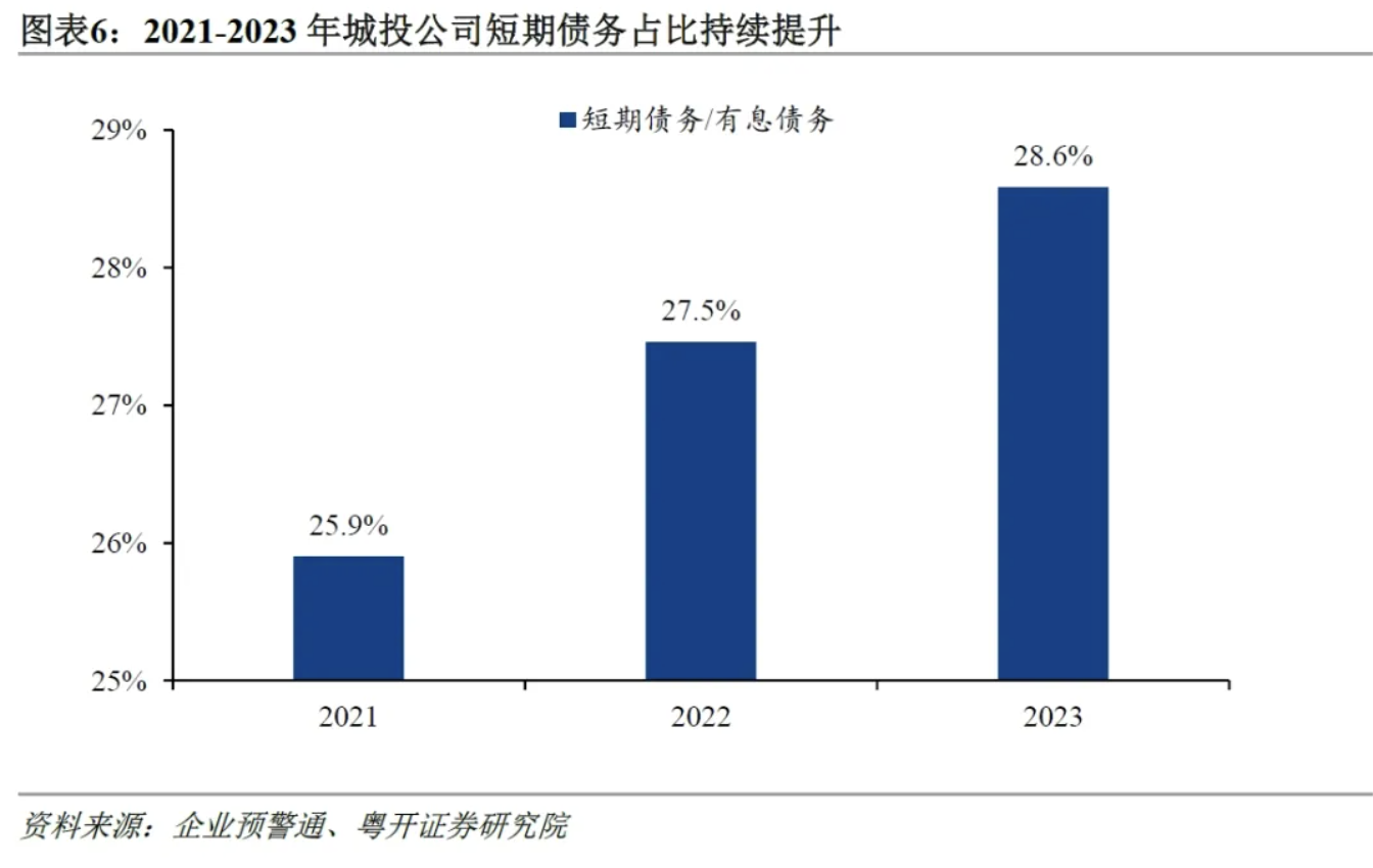 六是城投公司有息债务中短期债务占比提升,流动性风险进一步加剧。从城投公司总负债的结构来看,2023年有息债务占比为65.5%,较上年提高0.2个百分点,与政府清欠过去拖欠企业账款背景下城投公司也相应支付下游企业欠款有关,从而无息债务占比下降、有息债务占比上升。进一步从期限结构来看,随着城投公司外部融资环境持续收紧,长期债务的融资面临诸多不确定性,融资难度较大,因此城投公司转向短期借款以应对流动性危机,导致城投公司有息债务中短期债务占比逐年攀升。截至2023年末,城投公司短期债务占有息债务的均值为28.6%,较上年提高1.1个百分点。