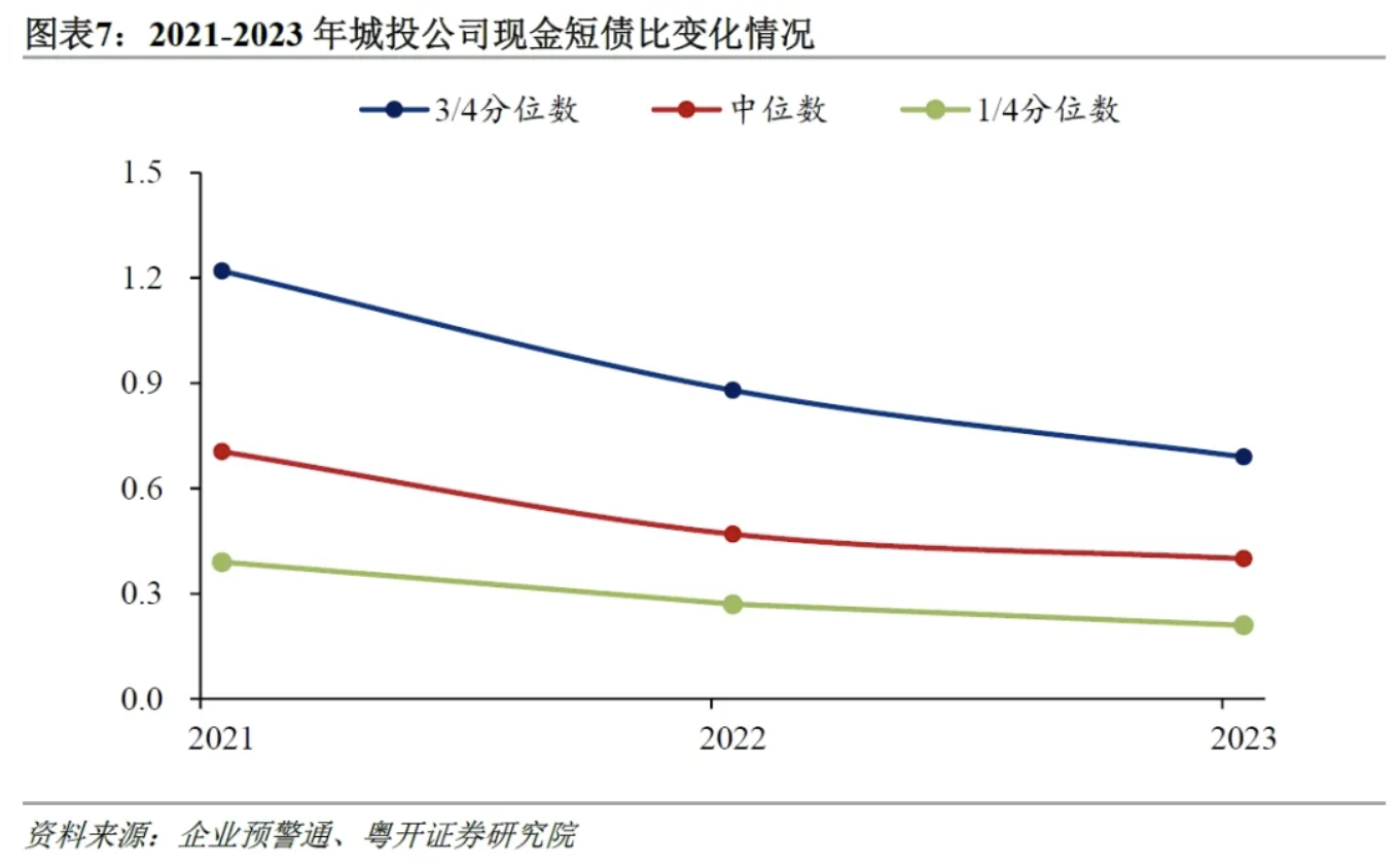 与此同时,城投公司的货币资金减少,导致现金短债比呈现下降趋势,短期流动性风险加大。2023年城投公司现金短债比中位数仅有0.4,85.6%的城投公司现金短债比小于1,即近九成城投公司的货币资金无法覆盖短期到期债务。