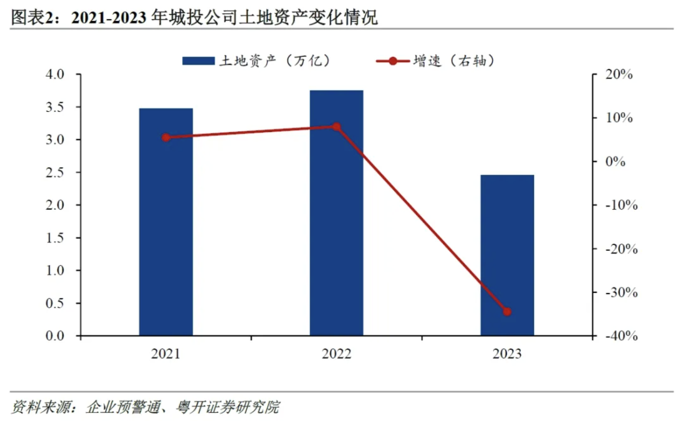 二是房地产行业持续低迷、城投公司流动性紧张以及政策限制三重因素叠加下,城投托地现象减少,土地资产大幅减少。2022年在房地产市场持续低迷、房企面临较大的现金流压力下,房企拿地的积极性不高,导致土地市场热度走低。在这一时期,城投公司摇身一变成为土地市场的重要参与者,城投托地现象较为普遍,导致当年城投公司土地资产大幅增加,2022年城投公司土地资产增长8.0%。2023年城投拿地现象出现逆转,城投公司土地资产大幅下滑,较上年下降34.5%。2023年城投公司土地资产占总资产的比重为2.2%,较上年下降1.3个百分点;土地资产占总资产比重中位数为0.7%,较上年下降0.5个百分点。首先,来自于政策层面的约束,2022年底,财政部发文禁止通过国企购地等方式虚增土地出让收入,限制城投公司托地行为。其次,受房地产市场持续低迷的影响,土地资产的价值下降,流动性减弱,城投公司拿地的意愿减弱。最后,随着化债的进行,城投公司自身流动性紧张,不得不将有限的资金用于偿债,甚至需要变卖土地资产来偿还债务,城投公司拿地的能力下降。