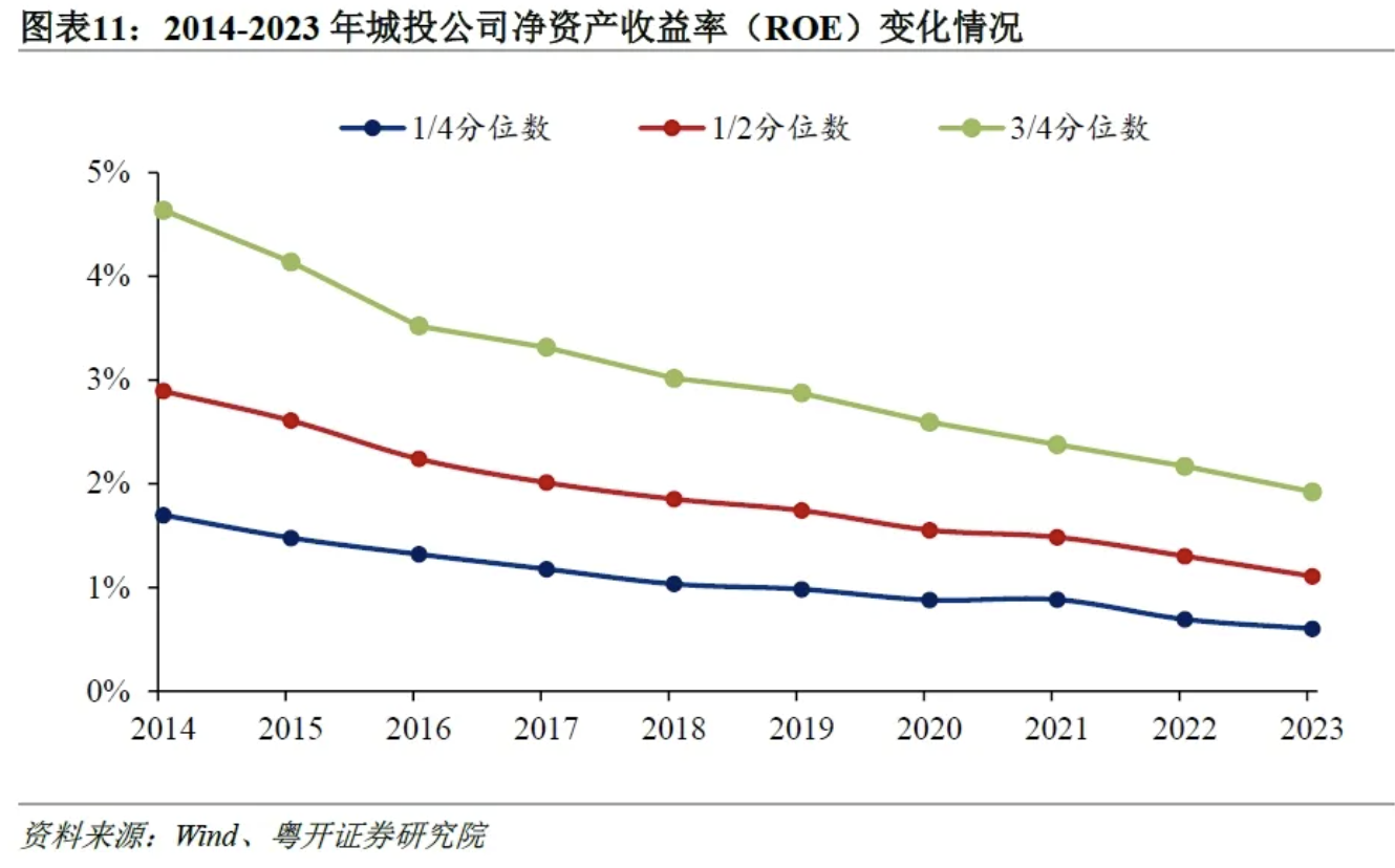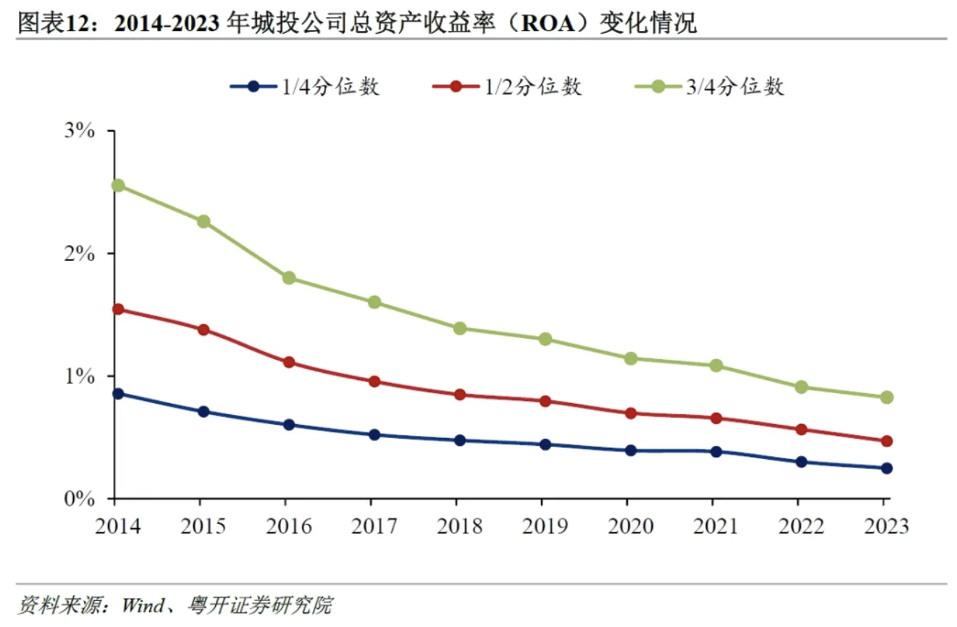 九是当前城投公司的盈利能力仍然较弱,净资产收益率和总资产收益率处于下降趋势。城投公司的盈利能力下滑主要来源于两方面的因素:一是主营业务特性,城投公司主要经营公路、桥梁、保障房等具有公益性质的项目,而这些项目普遍盈利能力较弱,难以产生足够的利润;二是近年来随着宏观经济下行以及房地产市场调整,城投公司的主营业务收入疲软,同时地方财政紧平衡态势下政府补贴减少,进一步削弱了城投公司的盈利能力。2023年城投公司净资产收益率(ROE)和总资产收益率(ROA)中位数分别下降至1.1%和0.5%,分别较2022年下降0.2和0.1个百分点。