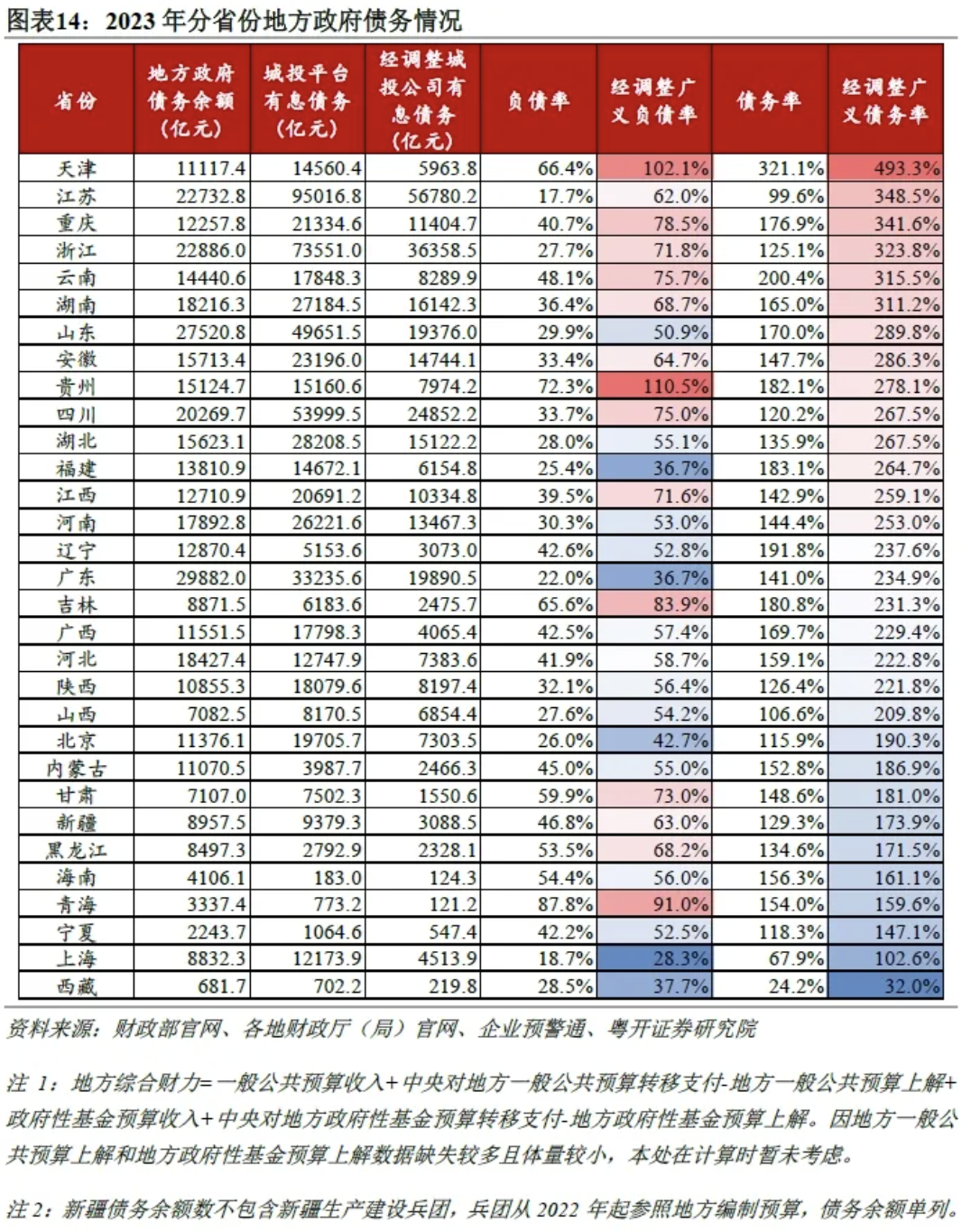 在测算隐性债务时,直接将所有城投公司的有息债务进行简单加总的方法会显著夸大隐性债务规模。原因在于,大多数城投公司已开始启动转型,部分已完成市场化转型,导致城投公司的部分债务是为了经营性业务而举借,将其全部视作地方政府有兜底责任的隐性债务不合理。为了更准确地测算隐性债务的规模,需要对有息债务的来源进行分类,分辨出是因承接公益性或准公益性项目而举借的债务,还是因自身经营性业务而举借的债务。然而,由于公开数据的限制,无法直接对有息债务进行项目溯源。因此,本文采用一种同比例假设的方法,即城投公司按照其营业收入的比例为不同项目举债。假定城投公司主营业收入中公益性或准公益性项目收入的占比等同于全部有息债务中隐性债务的比重。通过计算公益性和准公益性业务在城投公司主营业务收入中的占比,间接估算出城投公司有息债务中隐性债务的比例。经调整后,测算出城投公司中可归为隐性债务的规模约为32.2万亿元,这一数据较城投公司有息债务总规模下降了49.8%,经调整后的广义债务率和广义负债率分别为237.0%和58.2%。