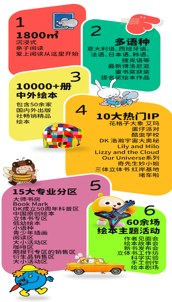 本届BIBF绘本展以“打开绘本 看见世界——越长大,梦想越大”为主题,与花格子大象、蛋仔派对、酷虫学校、Lily and Milo、DK浩瀚宇宙大奥秘、奇先生妙小姐等10大热门IP合作,在展示逾万册多语种优秀原版绘本,设立15个专区、举办60多场绘本主题活动,打造沉浸式亲子阅读空间。
