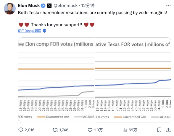 特斯拉公司的投资者投票表决支持首席执行官埃隆·马斯克的560亿美元薪酬方案,并支持把公司注册地迁至得克萨斯州。特斯拉6月13日在奥斯汀举行的年度股东大会上宣布了上述结果,但没有披露投票细节。马斯克前一天晚上就在X平台发帖预示结果,称两项决议正“以较大优势通过”。