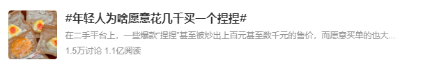 前几天,趋势君在微博热搜上看到#年轻人为啥愿意花几千买一个捏捏#的词条,不禁大为震惊,此前我们关于年轻人的讨论大多是围绕带火了1688、剩菜盲盒、平替经济等等,这些似乎都在表明年轻人们在变着花样省钱,而“捏捏”是靠着怎样的魔力能让“抠门”的年轻人们一掷千金的?