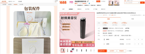 事实上,青眼调查发现,尚品科技并非个例。虽然家用射频仪已经“入械”,但如1688等平台上仍能搜索到各类射频仪,而这些产品可分为两类:其一,产品名和宣传详情页面中未出现“射频”字样,但产品实际仍带有射频功能;其二,也有企业直接在商品详情页中明确标注使用了射频技术。