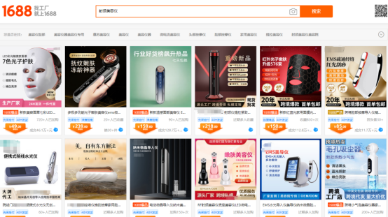 在这一市场大背景之下,美容仪品牌们也开始积极“自救”,并从其他赛道突入,开始大批量推出非射频类新品。以1688平台为例,搜索排名前列的产品除按摩仪、精华导入仪等较为基础的产品外,其余多为EMS微电流类和LED面罩类产品。