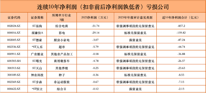 这逾300家被问询公司中,有近8成(78%)公司去年扣非前后净利润孰低者(下称“净利润”)为亏损,其中,ST易购(002024.SZ)、深康佳A(000016.SZ)、ST德豪(002005.SZ)、*ST人乐(002336.SZ)、广农糖业(000911.SZ)、ST曙光(600303.SH)等10家公司已连续亏损长达10年之久。