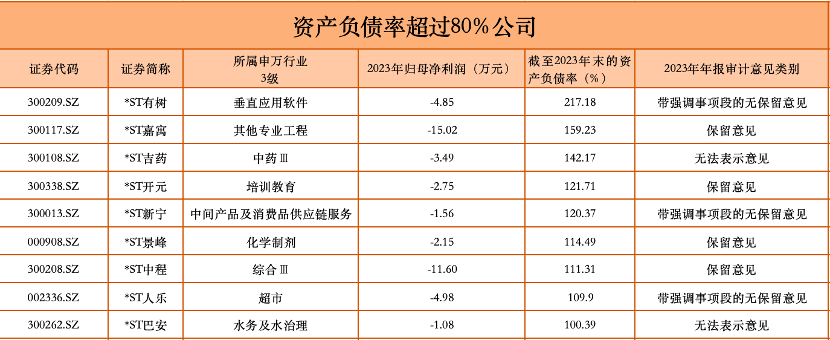 债务方面,有约60家公司资产负债率超过80%,其中,*ST有树(300209.SZ)、*ST嘉寓(300117.SZ)、*ST吉药(300108.SZ)、*ST开元(300338.SZ)、*ST新宁(300013.SZ)、*ST景峰(000908.SZ)、*ST中程(300208.SZ)、*ST人乐(002336.SZ)等9家公司资产负债率超100%,处于“资不抵债”境况。