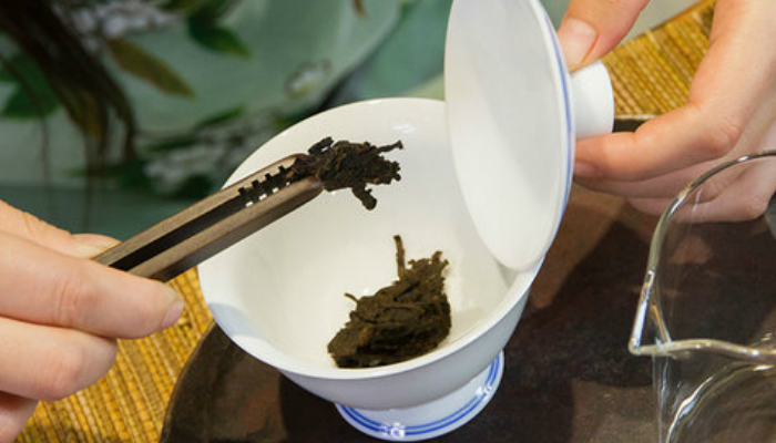 紧压茶的投茶量,差不多占盖碗容量的1/5,有些紧压茶比较紧,密度较大,也可以适当减少投茶量进行微调。为了舒张茶叶,紧压茶的冲泡过程中也常常会用到温润泡。