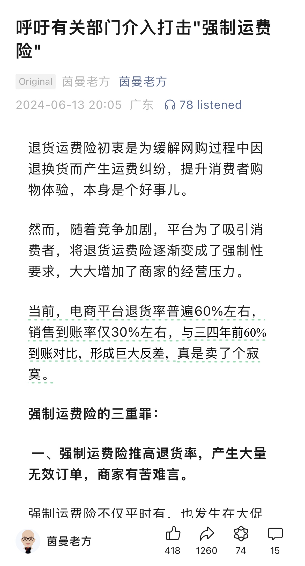 为此,方建华呼吁有关政府部门介入监管,确保运费险不被滥用;还希望电商平台体察企业经营冷暖,不把“以用户为中心”落实成为“增加经营负担”为导向;并在最后呼吁消费者理性消费。