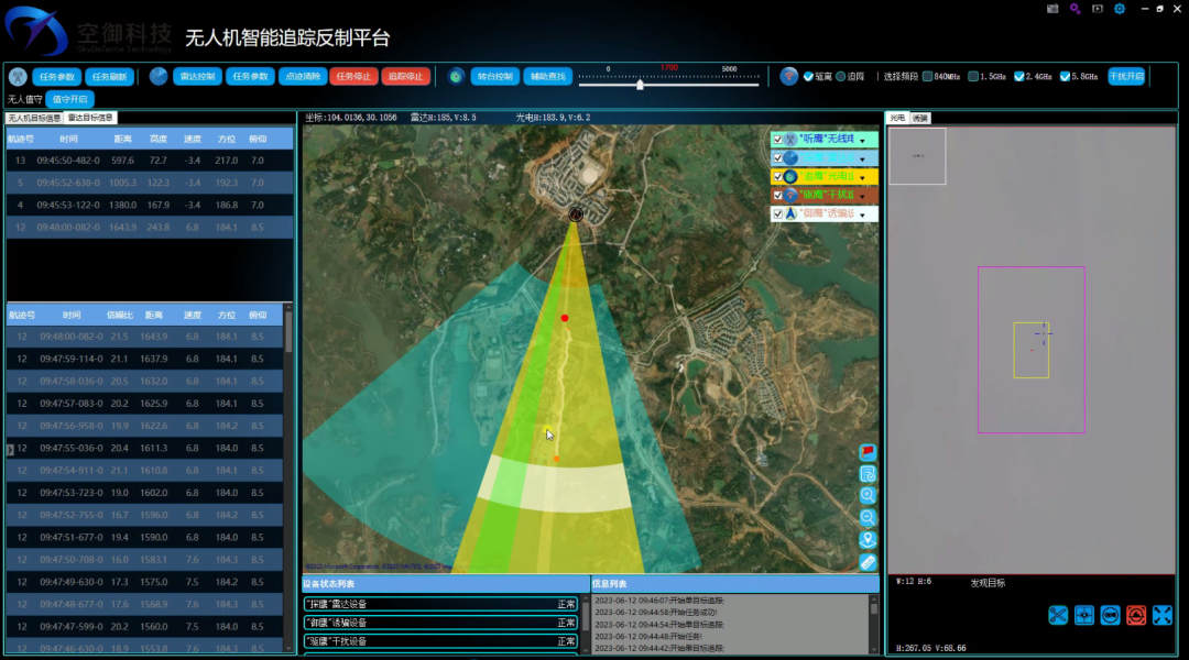 这套系统的特点在于其分布式设计,意味着它可以覆盖更广的区域,通过多个探测点协同工作来增强对无人机目标的识别与定位能力,相比传统单一探测设备,具有更高的准确性和反应速度。吴浩解释道,“我们解决方案的创新点在于不局限于硬件设备,还自主研发了软件平台——无人机智能追踪反制平台,能够对收集到的数据进行快速分析,实现对无人机威胁的智能评估与决策支持。