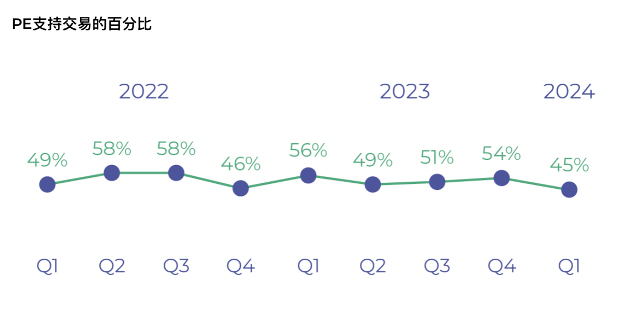 在2024年第一季度涉及私募股权的交易比例有所下降,因为在高利率环境下,杠杆交易仍然具有挑战性。然而,随着预期的利率降低应该会缓解这种情况,在年底或会看到更多的私募股权参与。