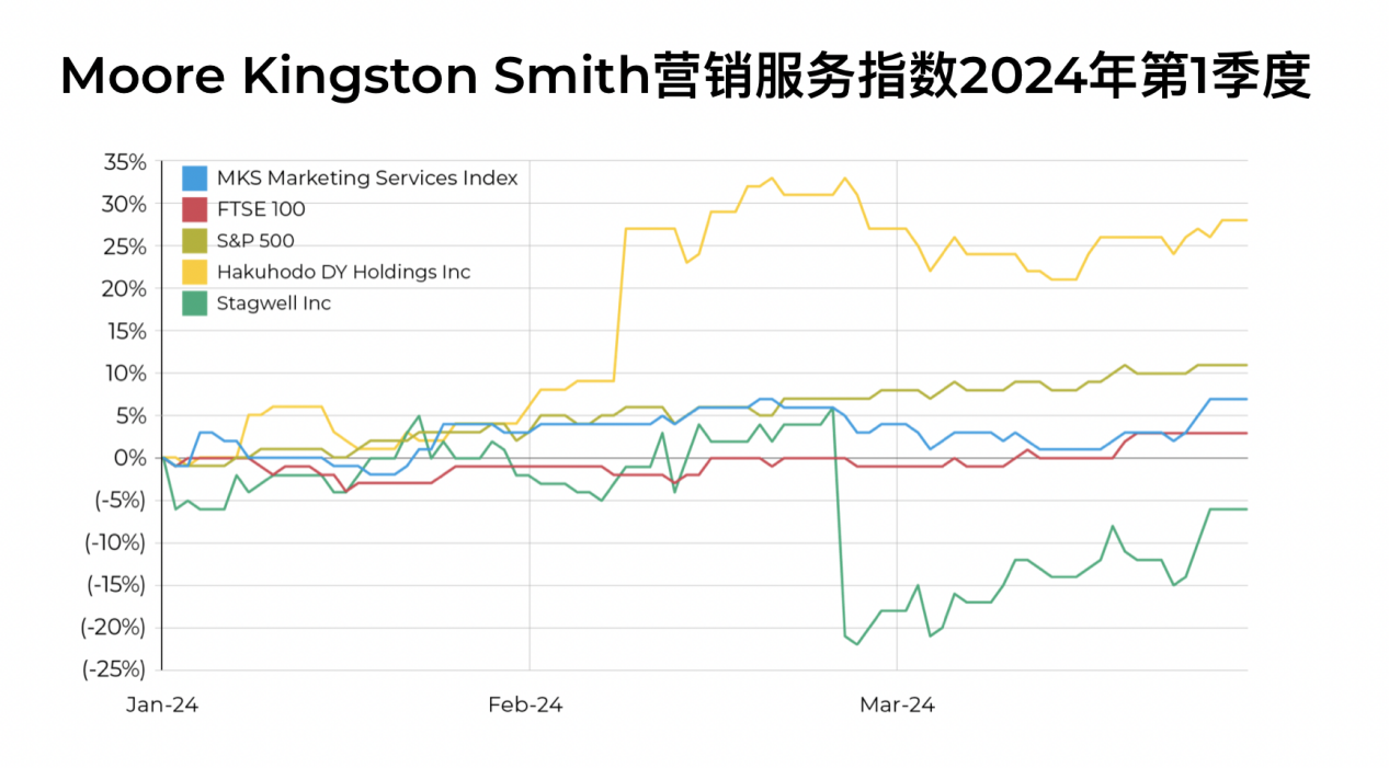 标准普尔500指数在第一季度上涨了11%。富时100指数也上涨,尽管只有3%。摩尔金斯顿史密斯营销服务指数介于两者之间,期间上涨了7%。在摩尔金斯顿史密斯营销服务指数的14家公司中,有9家在第一季度股价上涨;只有5家在季度末处于负增长区域。