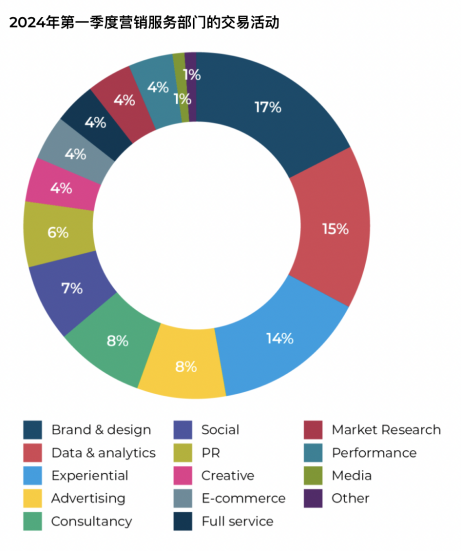 早2024年第一季度,品牌和设计成为收购者最喜欢的营销服务类别。它占据了其记录的所有营销服务交易的17%,数据和分析以16%位居第二。