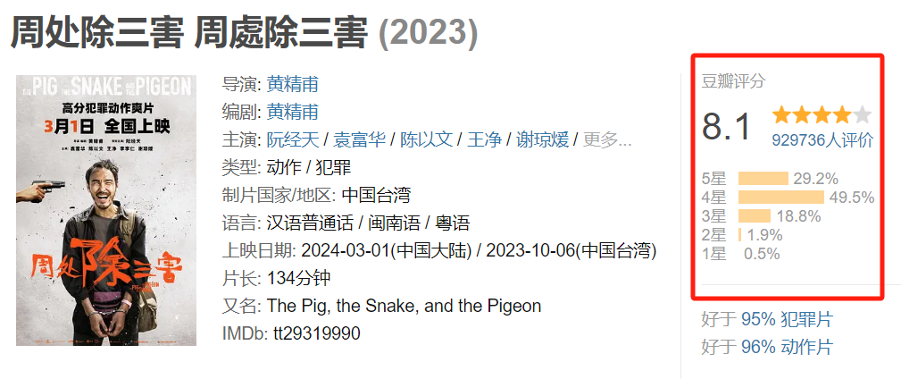 当然,并不是只有“接地气”和紧贴生活的作品,就一定会成功;也不是与我们生活有距离的题材就一定“扑”。《周处除三害》里的故事其实距离大部分老百姓有点远,围绕邪教组织、犯罪、迷信等议题展开。但是口碑带动票房,让这部毫无爆款征兆的电影,最终赢得12.9亿票房。或许正如网友说的,“电影想要探讨点真东西,关于善恶,关于意义,也关于自我成全。而这些引发我们反思。”