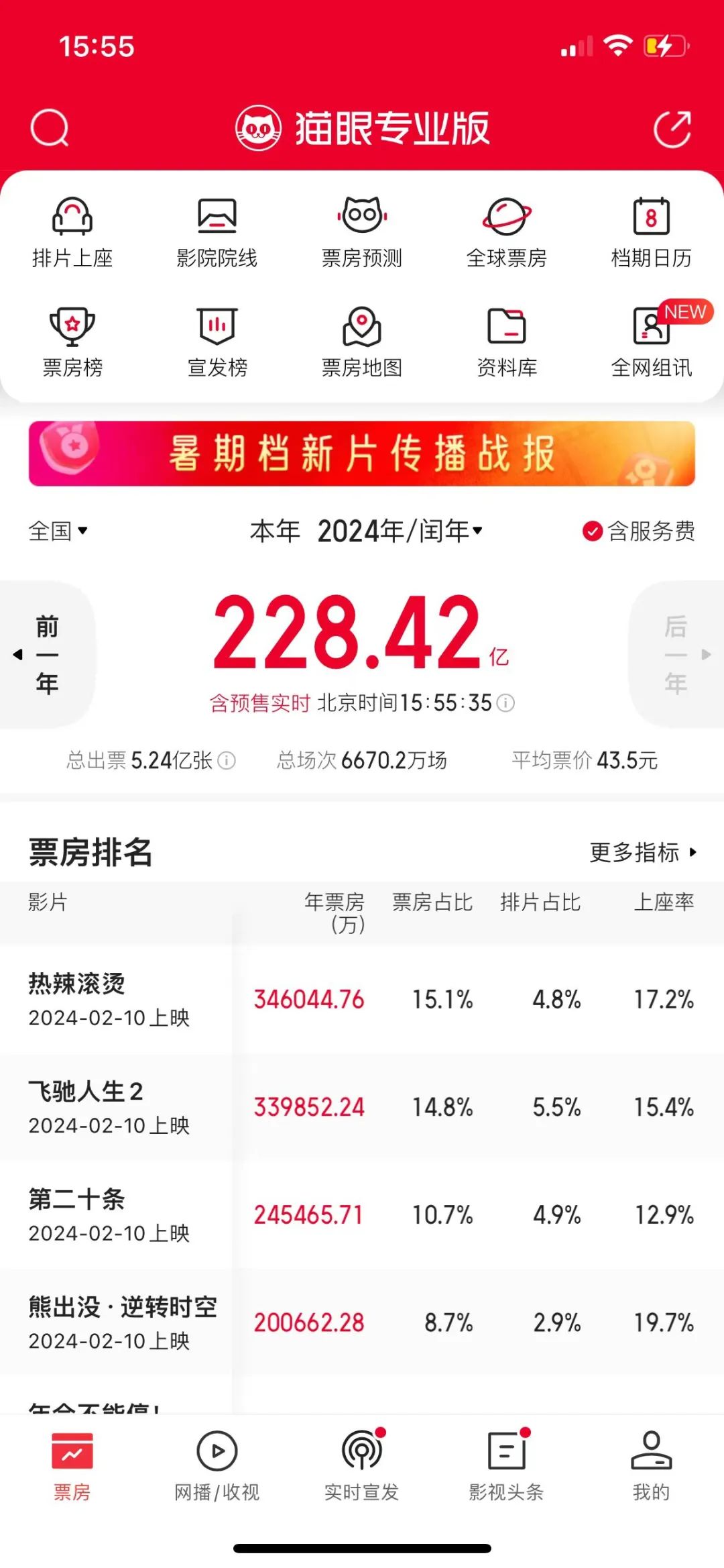 回望2023年全国电影票房数据,总体为549.15亿元,国产电影票房为460.05亿元,占总票房的83.77%,创历史新高。共有11部影片票房突破10亿元,且均为国产影片。截止发稿前,2024年全国电影票房228.42亿元。虽然2024年已进入半程,但目前票房数据并没有呈现出大幅超越去年的迹象。
