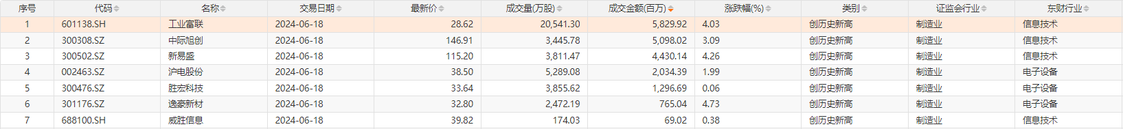 6月18日,Choice数据统计,今日共有7只个股股价创历史新高,主要分布在信息技术、电子设备行业,包括中际旭创、工业富联、新易盛、沪电股份等。
