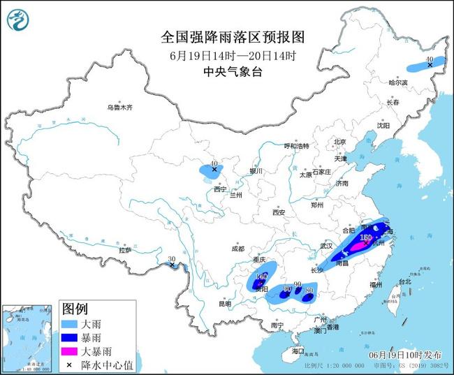19日上午10时,中央气象台继续发布暴雨黄色预警:预计,6月19日14时至20日14时,苏皖南部、上海、浙江北部、江西北部、湖北东南部、湖南东部和南部、贵州中北部、广西北部、广东西北部以及黑龙江东北部、青海东北部等地部分地区有大到暴雨,其中,安徽南部、江西东北部、浙江西北部、贵州中部等地部分地区有大暴雨(100~150毫米)。