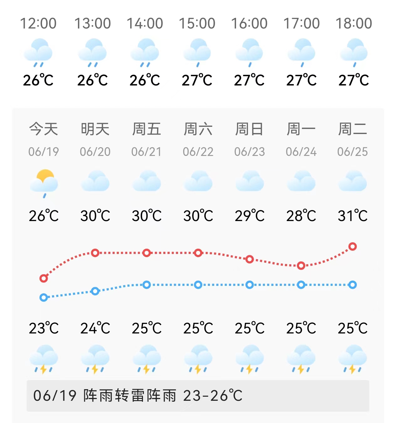 入梅后本市气温起伏不大,极端最高气温30℃左右,最低气温维持在25~26℃之间。
