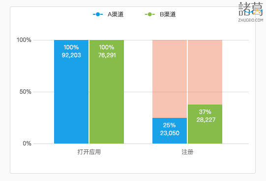 你可以看出一个问题,从A 渠道来的75%的用户和从 B 渠道来的63%的用户只是下载了你的应用,但并没有注册。