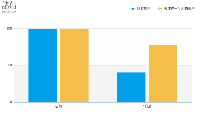 这同样没有固定的成功公式,你必须通过「用户分群」来针对不同的可能性做实验。在我们这个例子中,你将会看到,当你对比「所有新增用户」与「关注过一个人的用户」的次日留存时会发现什么: