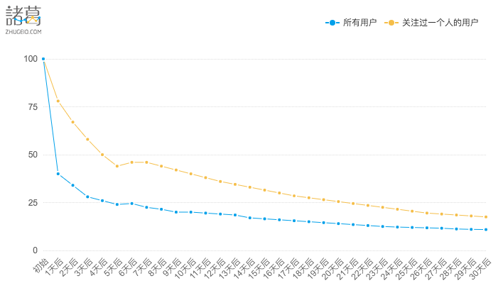 在30天后,「关注过一个人的用户」的留存率是17.5%,「所有用户」的是10.9%。这可能看起来不是那么显著,但在长期留存上,即便是一个小凸起,对你来说也是意义重大。