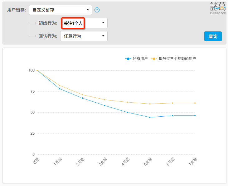 然后,你可以看到其它因素是怎样促进留存的。通过诸葛io,你可以比较「播放了三个视频的用户」与「全部用户」,比较两个用户群在「关注了一个人」后的留存情况。