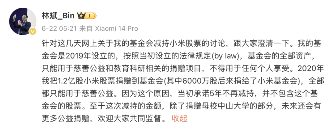 为回应非议,6月22日清晨,小米集团联合创始人、副董事长、执行董事林斌通过个人微博对近期“减持套现”相关传闻作进一步的说明。在微博内容中,林斌表示,“其基金会是2019年设立的,按照当初设立的法律规定(by law),基金会的全部资产,只能用于慈善公益和教育科研相关的捐赠项目,不得用于任何个人享受。2020年把1.2亿股小米股票捐赠到基金会(其中6000万股后来捐给了小米基金会),全部都只能用于慈善公益。因为这个原因,当初承诺5年不再减持,并不包含这个基金会的股票。至于这次减持的金额,除了捐赠母校中山大学的部分,未来还会有更多公益捐赠。” 当然,市场也关注到,林斌减持套现的数额与捐赠数额有差额,这可能也为林斌所说的“未来还会有更多公益捐赠”埋下伏笔。
