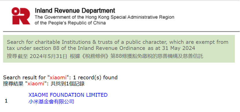 进一步搜索可以得知,实际上,小米分别在中国内地和香港特区成立了两家公益基金会。其中,上述提到的“北京小米公益基金会”是经北京市民政局审批核准,于2019年2月3日成立的公益基金会;而另外一家是小米基金会有限公司(Xiaomi Foundation Limited),是一家根据中国香港税务条例(Inland Revenue Ordinance)第88款而设立的公益基金会(摘自:2021年7月16日小米在港交所发布的公告)。由此,另一家设立在中国香港的基金会浮出水面。