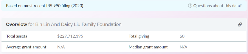 受捐赠主体3:Bin Lin and Daisy Liu Family Foundation(美国加州的私人基金会)