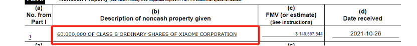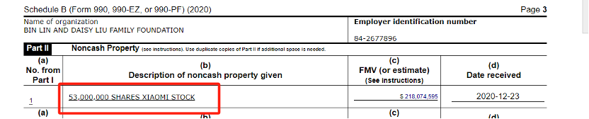 说回林斌的受捐赠主体的讨论。根据林斌在微博上发出的对外澄清,2020年其将1.2亿股小米股票捐赠到了基金会,其中6000万股捐给了小米基金会,上文已经有所阐述;而剩余6000万股,笔者推测,很可能是进入了前述Bin Lin and Daisy Liu Family Foundation。