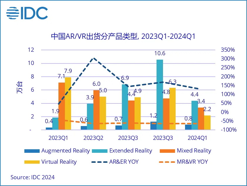 IDC报告则显示,2024年第一季度中国AR/VR头显出货10.7万台,同比2023年下滑37.8%。其中AR(增强现实)出货0.8万台,同比上涨119.2%;MR(混合现实)出货3.4万台,同比下滑52.7%;VR虚拟现实出货2.2万台,同比下滑72.6%。