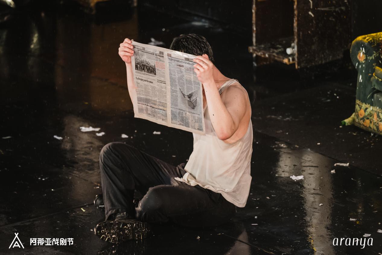 在阿那亚露天的“酒神剧场”里,观众们纷纷穿上了剧场准备的透明雨衣。扮演“自杀者”波波的演员从观众席间的通道走向舞台,并即兴调侃道——原来“天堂”就是剧场的模样,“天使”们竟都穿戴上了“高科技”,引发了一片笑声。演出前放在舞台用作道具的一张旧报纸已被雨水淋湿,到了波波朗读报纸的情节,演员只得将湿漉漉的报纸小心翼翼展开,这段表演也构成了意外的笑点。