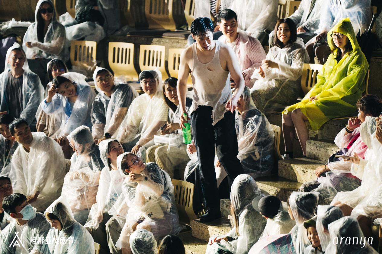 6月21日夜,话剧《枪,谎言和玫瑰》演出中途,下起了雨。