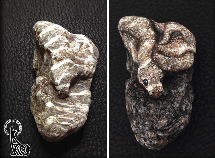 为了让石头最终呈现出我心目中的样子,我是处理时会格外小心,举个例子,我会反复问自己,这是画脊椎的最佳位置吗?这感觉对吗?我这样画是不是和这块石头的天然造型不符合呢?只有当我完全确定时,我才会在石头上落笔。因此我的作画过程更像是一次与石头的对话,是石头决定了我该画些什么,而不是我。我想创造的艺术,是通过与石头交流,在我的手心孕育出一条新的生命。我想把这种生命感画出来,让孕育在石头内的生机迸发出来。