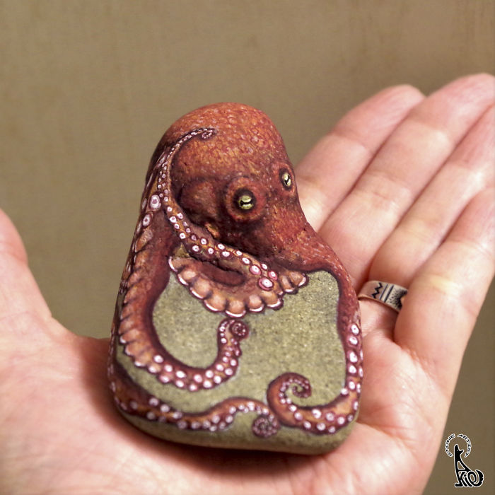 所以我只会选择那些给予我灵感的石头,并且我很尊重这种灵感,因此我从来不会对石头进行切割,好让它们看上去更像某种形状。石头可能并不符合我们平常对生物体的定义,但当我想到这颗躺在我手心的小石头,是花费了多长的时间,才从一块山上的巨石变成了如今的模样,它在数千年间见证了地球演变的历史,而我能感受到这些历史都存在于它体内。我认为每一块石头体内都蕴藏着生命,所以有时候我在画画时,还会一边和它们说话。