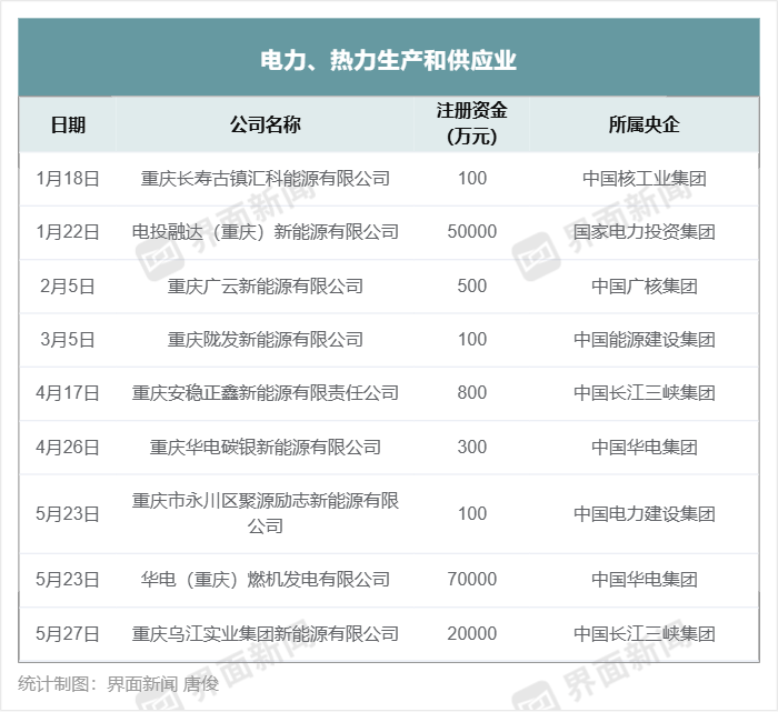 5月23日成立的华电(重庆)燃机发电有限公司,是中国华电集团的二级子公司,注册资本7亿元。1月22日成立的电投融达(重庆)新能源有限公司,是国家电力投资集团的二级子公司,注册资本5亿元。