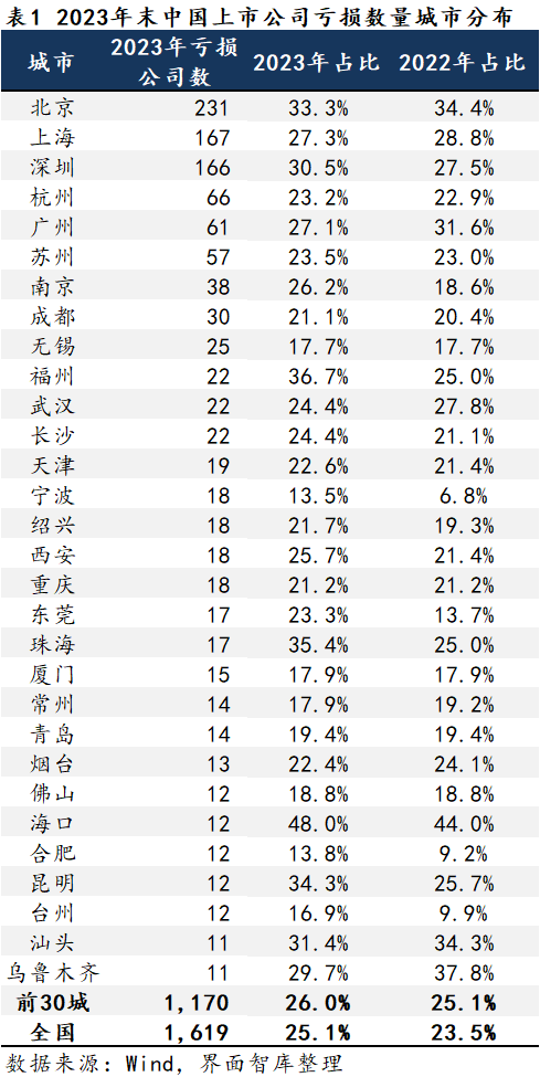 从头部城市来看,北京、上海、深圳上市公司亏损家数及占比均位居前列。北京共有231家上市公司出现亏损,占比高达33.3%,较2022年略有下降。上海和深圳的亏损家数分别为167家和166家,占比分别为27.3%和30.5%。