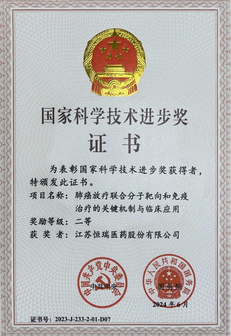 6月24日,2023年度国家科学技术奖在京公布,恒瑞医药参与、由山东第一医科大学附属肿瘤医院牵头的“肺癌放疗联合分子靶向和免疫治疗的关键机制与临床应用”项目荣获国家科学技术进步二等奖。这是公司继2016年度、2017年度获奖之后第3次获得国家科技进步奖。