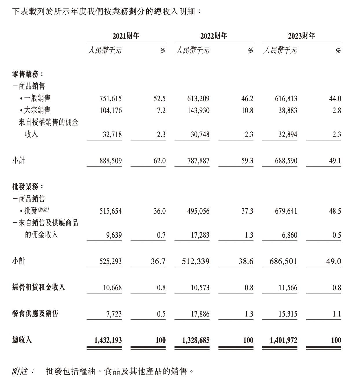 从收入分类看,宏信超市的收入最主要的两部分是零售业务和批发业务,其中零售业务的收入从2021年的8.88亿元下滑至2023年的6.88亿元,而批发业务收入从2021年的5.25亿元增长至2023年的6.86亿元,几乎与零售业务收入持平。