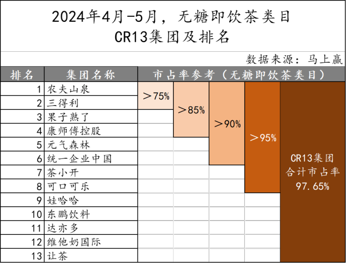 根据专注线下零售监测的马上赢情报站数据,2024年4-5月,无糖即饮茶类目的增长势头依旧强劲,整体销售额同比2023年4~5月上涨达14.26%。在市场份额上,无糖即饮茶在整体饮料类目中的市场份额同比增长达26.17%,超过同期销售额增幅达10%以上。