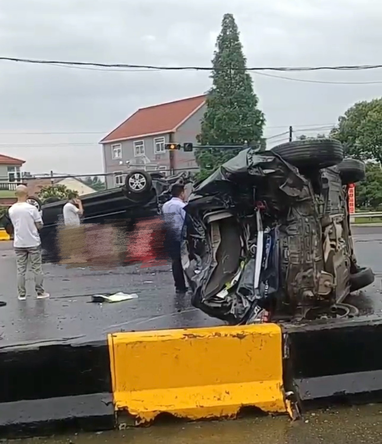 现场视频显示,事发现场,一辆黑色轿车侧翻横在路中央,车尾被撞烂;另一辆黑色轿车四轮朝天,有多人倒在车边。