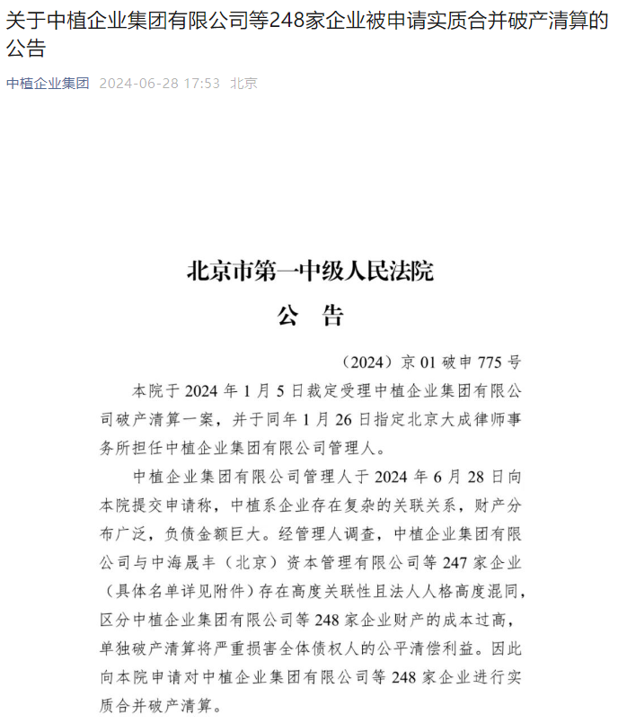 6月28日,中植企业集团有限公司(简称“中植集团”)官微发布《关于中植企业集团有限公司等248家企业被申请实质合并破产清算的公告》。