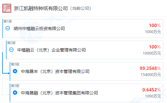 凯恩股份披露,截止公告日,凯融特纸持有公司股份数量为102,467,917股,占公司股份总数的21.91%。界面新闻根据天眼查获悉,穿透后,中海晨丰(北京)资本管理有限公司、中海晟融(北京)资本管理集团有限公司间接控股凯融特纸。