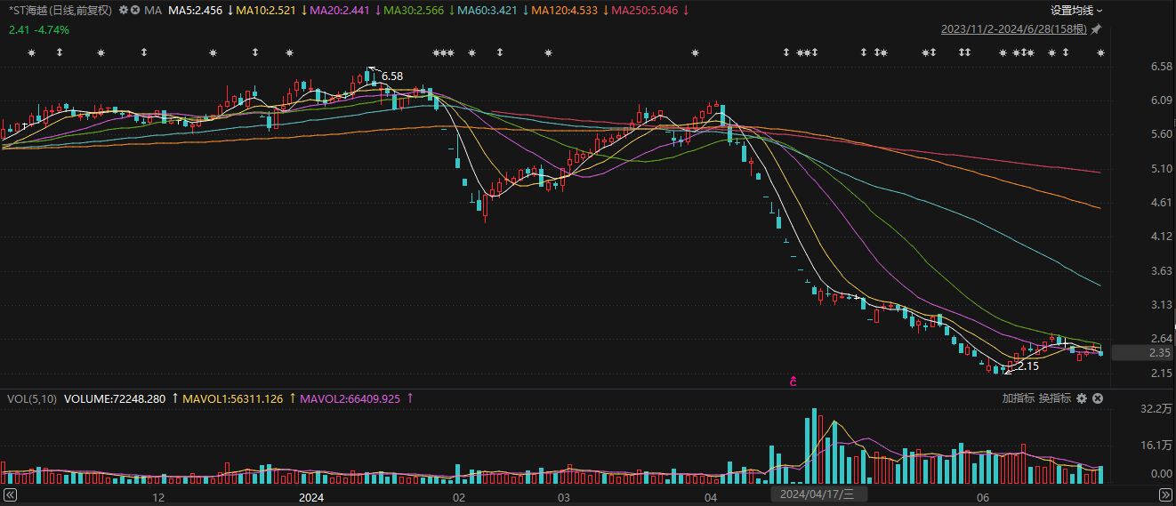 6月28日,*ST海越收跌4.74%,逼近跌停线,收盘价2.41元/股。至此,2024年以来,该公司股价已累计下跌超61%。