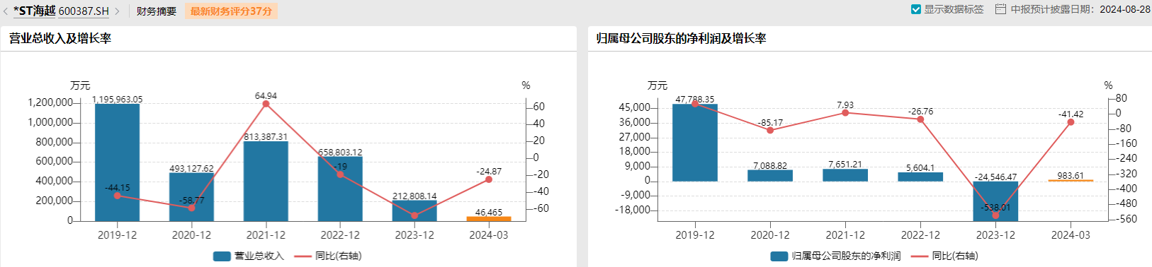 *ST海越于2004年2月登陆上交所上市,公司的主营业务为汽柴油、液化气的仓储、批发和零售;股权投资和物业租赁;各类油品和液体化学品的码头装卸;仓储以及贸易;碳酸锂的生产和加工。2023年,受存货等相关资产减值损失的影响,公司净利润亏损24546.47万元,2023年期末归属于上市公司股东的净资产28.69亿元;2024年一季度,该公司归母净利润同比下滑41.42%至983.61万元。
